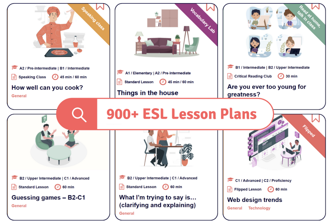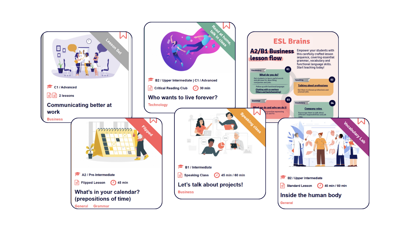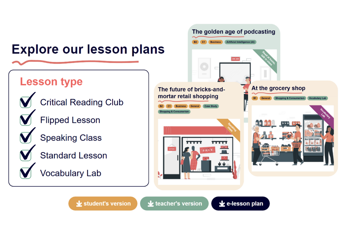 We offer lesson plans for every need: Speaking Classes to enhance communication skills, Flipped Lessons to encourage independent study, Critical Reading Classes to focus on active reading and Vocabulary Lab worksheets to boost vocabulary. For extended learning, you’ll also find Lesson Sets and Lesson Flows. Additionally, we provide standalone activities, including games, grammar and vocabulary exercises.