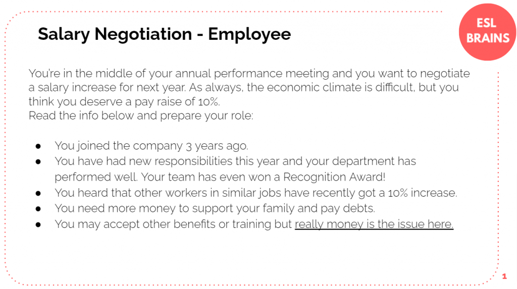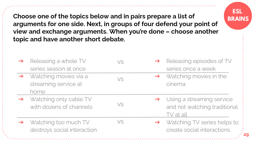 On a different occasion, and with a stronger and more confident student, you can prepare five arguments in favour before the class and ask them to come up with counter arguments, setting a time limit. While they are working on their arguments, take the role of a facilitator and guide your student when they need assistance, providing vocabulary, or clarification of the task.