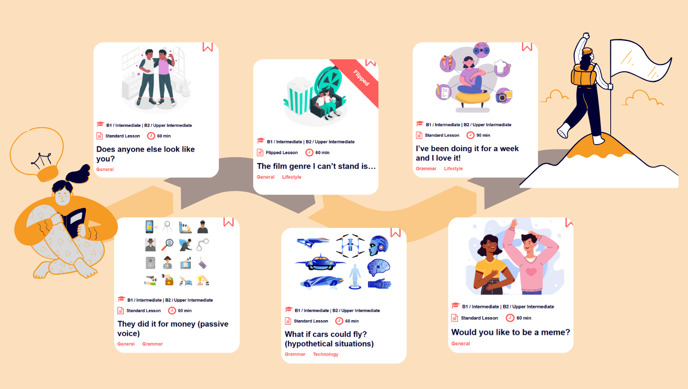 Lesson Flow is a sequence of lessons, designed to take your student on a particular learning journey. A flow contains 15-20 lessons covering the four skills as well as vocabulary, grammar and functional language. The additional follow-up lesson suggestions offer extra opportunities for reading and speaking practice, as well as targeted grammar exercises related to the topic. Lesson Flows are compilations of pre-existing ESL Brains lessons, but with a new purpose of helping teachers navigate learning in a more structured way. They serve as guidelines that you can and should customize by adding or removing lessons based on your students’ needs.