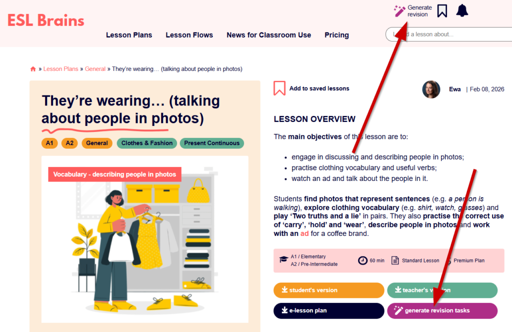 Revision Tasks Generator is available for Unlimited subscribers. To generate tasks, use the purple button 🟪 next to the lesson image. If you want to generate tasks for up to three lessons at the same time use the magic wand 🪄 in the top-right corner of the page and look for the lessons you need in the dropdown menu.